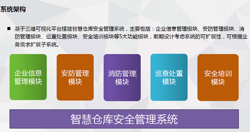 基于三维可视化平台搭建智慧仓库安全管理系统,主要包括:企业信息管理模块、安防管理模块、消 防管理模块、巡查处置模块、安全培训模块等5大功能模块。